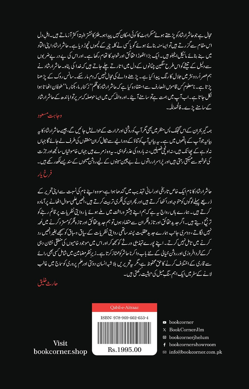 جن معاشروں میں رائج افکار، بااثر شخصیات، معاشرتی رشتوں اور انسانی جذبات کو باریک بینی، غیر جانبداری اور مثبت تنقیدی زاویوں سے دیکھنے والے ناپید ہوتے جائیں وہاں رفتہ رفتہ عامیانہ باتیں عقیدہ بن جاتی ہیں۔ اوسط سے بھی کم درجے کے لوگ دیوتا، معاشرتی رشتے زنجیراور انسانی جذبات بوجھ۔ حاشر ارشاد صاحب کی طبیعت میں سنجیدہ اور ذہین سوال پوچھے بغیر کسی بھی بات پر اعتقاد لے آنے کا میلان سِرے سے ہی موجود نہیں۔ وہ وسیع المطالعہ بھی ہیں، حسّاس بھی اور منطقی اور مدلل گفتگو کے فن سے پوری طرح واقف بھی۔ اُن کی تحریر میں جاذبیت بھی ہے اور روانی بھی۔ اُن کے مضامین کا مجموعہ نثری دلکشی اور موضوعات کے تنوّع اور دلچسپی کے باعث ایک عمدہ کاوش تو ہے ہی، لیکن میرے نزدیک اس سے بھی زیادہ اہم بات یہ ہے کہ یہ مجموعہ بےباکی اور خلوص سے روشن خیالی اور معاملات کی تہہ تک پہنچنے کی تحریک دیتا ہے۔ ہمارے معاشرے کو ایسے عاقل اور متجسّس سوچنے والوں اور ان کی کتابوں کی اشد ضرورت ہے۔ (اسامہ صدیق)
